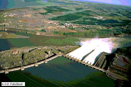 En esta fotografía aérea puede contemplarse la presa de Itaipú, proyecto conjunto de Brasil y Paraguay sobre las aguas del río Paraná, y su central hidroeléctica, la mas grande del mundo, de la que se consiguen considerables recursos energéticos para ambos países y el conjunto regional. Con una altura de 196 m y 8 km de largo, dispone de 14 vertederos que operan como cataratas artificiales.